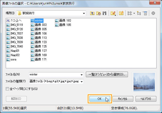 カレンダー用に用意された写真の場所が表示されます。デジカメの写真を保存した場所を表示して、写真を選択しましょう。