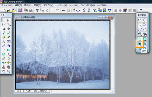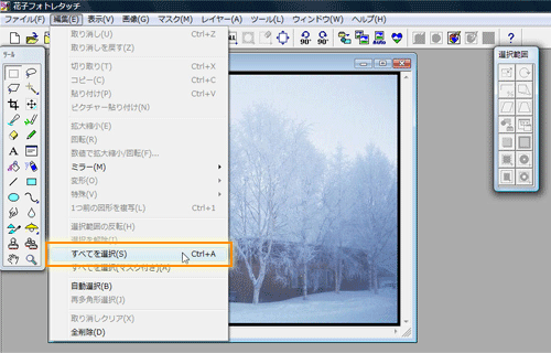 - 写真を読み込んで花子フォトレタッチが起動します。[編集]メニューから[すべてを選択]を選択して写真全体を選択します。