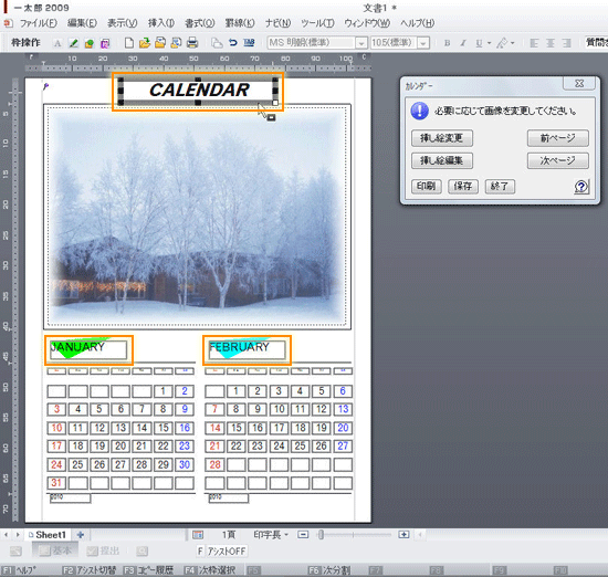 - カレンダー部分が出来上がります。挿絵のあるカレンダーのテンプレートを選んだので、「カレンダー操作パレット」の[挿し絵設定]をクリックして、写真を挿入しましょう。